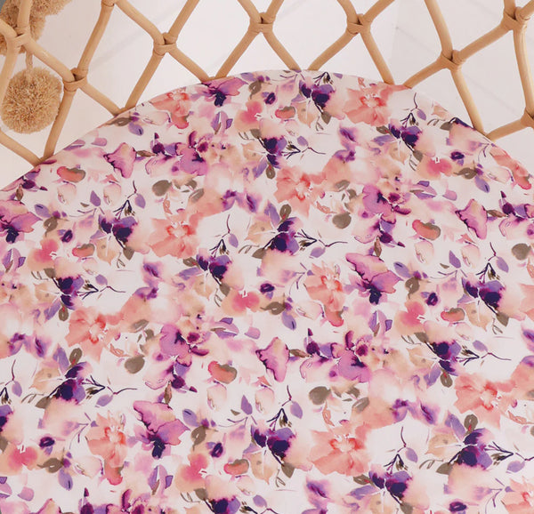 Snuggle Hunny Blushing Beauty Fitted Bassinet Sheet doubles as a Change Pad Cover and is made from snuggly soft organic stretch cotton jersey. It is stretchy so fits most bassinet mattress sizes and comes in a matching drawstring bag.